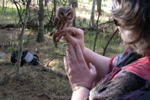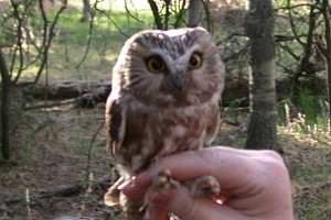 On May 31, 2002, Duncan and I, and a friend, Katherine Caine, had a marvellous opportunity to accompany Chuck Priestley, a University of Alberta environmental researcher, on an Owl Prowl to the north of Edmonton. He and some others had established a Saw-whet Owl Nest Box program, and were going out to band the owls that had not been previously banded. Luckily, Mom was in the nest box when we got there, and when the net was placed over the opening, she politely flew into it. |