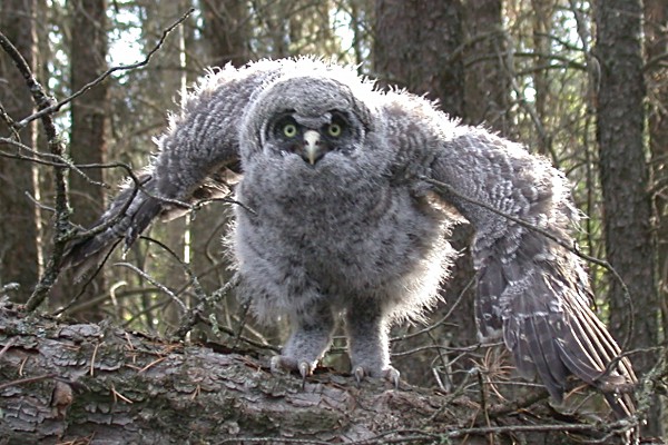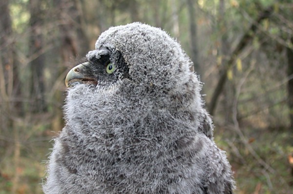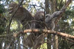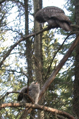 After finishing with the Saw-whets, we walked another half mile or so into the woods to find a staked out Great Grey Owl nest. It seems that the researchers had noticed a nesting pair of Great Greys in the neighborhood. However, when they found the male dead, seemingly having died of starvation, they were afraid that Mom and her two babies would share the same fate. So they searched for the nest and began supplying live mice to bring the little family through safely to fledging. |