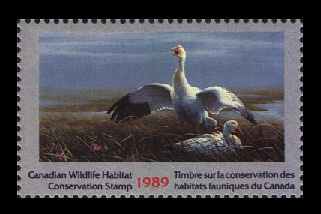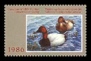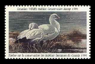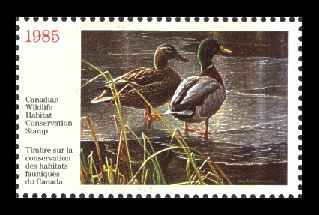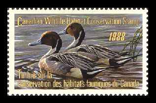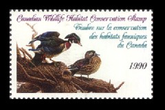 | Beginning in 1985, the Migratory Bird Regulations have required that the current habitat conservation stamp be purchased and affixed to a hunting licence before hunting. One stamp design is issued each year in a booklet format consisting of a single pane of one stamp. Unsold stamps, and licences bearing stamps are destroyed each year by Canada Post and the Canadian Wildlife Service. ... |