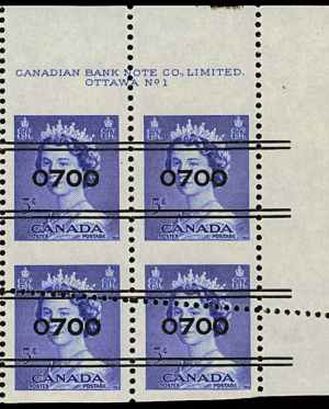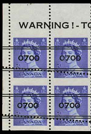 Courtesy of the G. D. Masse Collection By viewing both corner blocks, one can see how the diagonal perforation has created a horizontally imperf stamp at the top right corner. This creation of an imperf does not happen in the left corner block (see below). |