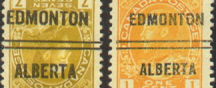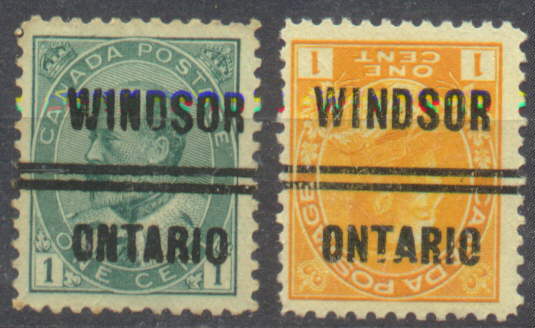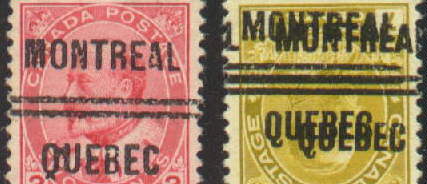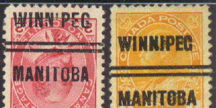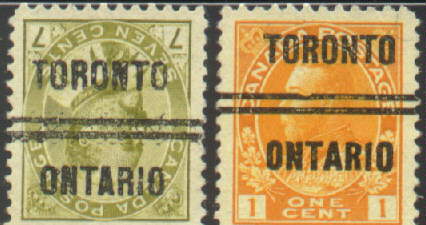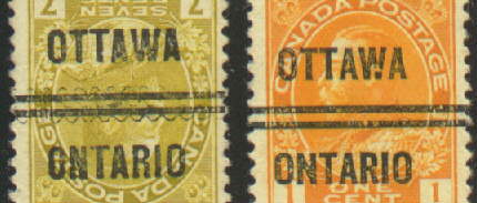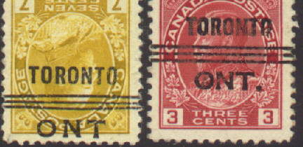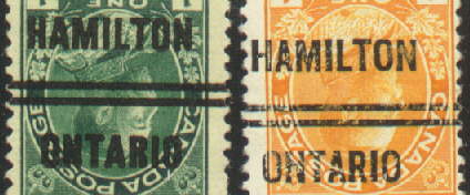 Often Misidentified Precancel Typesby David Marasco... Edmonton types 2 and 3: ... ![]() In type 2 the letters are all noticeably bigger than the type 3. If you already have a copy of both types 2 and 3 the comparison is easy. ... ... ... ... Hamilton types 3 and 4: ... ![]() To distinguish: Look at the H of Hamilton, type 3 is narrow and type 4 is wide. Look at the A of Hamilton, type 3 the bottom of the legs of A are spread wide, type 4 the bottom of the legs of A are closer together. Look at the 'foot' of the R of Ontario, type 3 is curved downward, type 4 is straight angled downward. ... Montreal types 2 and 4: ... ![]() You will see these differences. The B in Quebec: type 2 the B is taller and narrower, type 4 the B is shorter and wider. The A in Montreal is wider in the type 4. The M in Montreal is wider in the type 4. ... Ottawa Types 1 and 3: ... ![]() The N in Ontario is narrow and tall in type 1 and shorter and wider in type 3. The foot of the R in Ontario is curved in type 1 and straight in type 3. ... ... ... Toronto types 3 and 5: ... ![]() The foot of the R in Ontario is curved in type 3 and straight in type 5. The A in Ontario is narrow at the base in type 3 and wider at the base in type 5. ... ... ... ... ... Toronto types 7 and 12: ... ![]() In type 7 the 3 bars are bowed apart in the center of the overprint. type 12 the 3 bars are parallel. In type 7 ONT is longer, there are larger spaces between the letters, in type 12 the letters of ONT are closer together. ...... ... Windsor types 1 and 3: