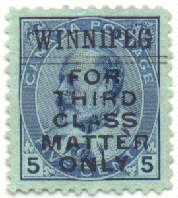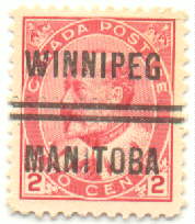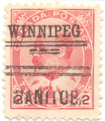 Winnipeg Type 1 and 2:Here is an example of a two type town overprint on the 2c Edward. Mr Walburn previously reported this on the 7c Edward (inverted). An article written by H. G. Walburn and published in the BNAPS "Topics" Magazine, volumne 4, #5, dated June 1947 said the following: " Winnipeg Manitoba on the 7 cent Edward VII, Hoover's #77, 'Winnipeg' and two fine lines below are in the small type used for Universal style #202 (Winnipeg type 2) and below are two heavy lines and 'Manitoba' in Universal style 200 (Winnipeg type 1)." I have checked the precancel in every way and it appears to be perfectly genuine, but how to explain its origin is another matter. The best theory I can offer is that a broken plate of type 1 was temporarily repaired with a portion of the plate of type 2, possibly no longer used (only the 1 c, 2c and 5c were precancelled with type 2). I say "temporarily repaired" because type 1 was used for another 20 years without any irregularities showing up on other issues." Note: "Hoover's #77" refers to the old Hoover Brothers Catalogue